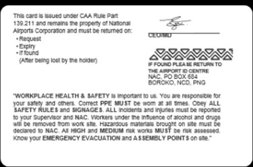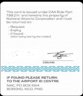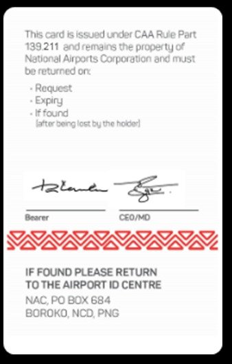 The National Aviation Security ID Centre may issue a PNG Red ASIC to a person in order to provide the holder access to Port Moresby International Airport and any Security Designated and gazetted airports in Papua New Guinea.